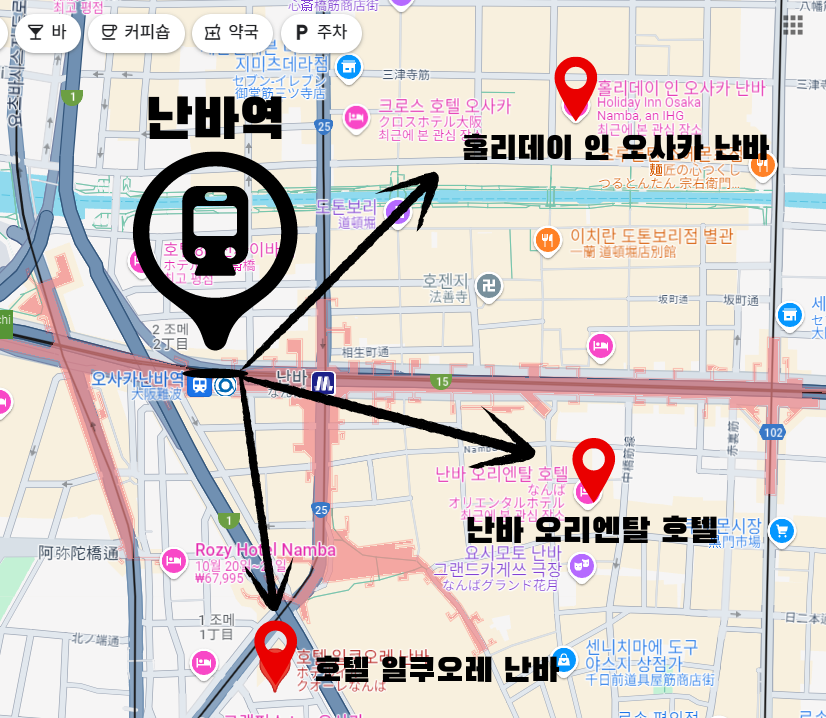 - 난바역에서 도보 5~10분 정도에 있는 가까운 호텔을 찾는 분
