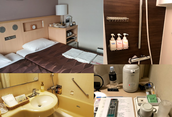 호텔 안 인테리어나 가구는 좀 올드한 느낌입니다. 별로 인테리어라고 할 것도 없고 필요한 것 위주로 불편함 없이 구비되어 있어요. 하지만 오래된 거에 비해 청소를 정말 깨끗하게 잘해 놔서 찝찝함 1도 없어요. 일본 호텔 특성상 방안이 그렇게 크지는 않아요. 만약 큰 캐리어 가져가면 좀 불편할 수도 있어요.